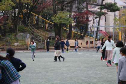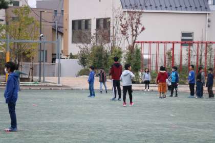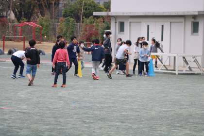 先生も一緒に、朝遊びを楽しんでいます。クラス遊びをしている学級もあります。