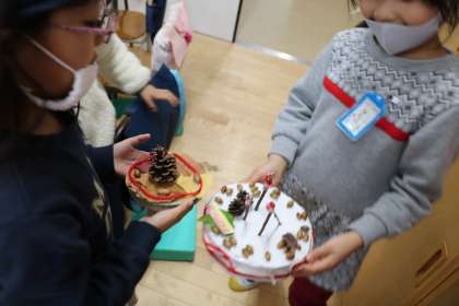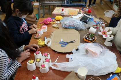 学級で作るものを決めて楽しみます。写真の学級は、お店屋さんを考え、商品を作っています。かわいいケーキの数々です。