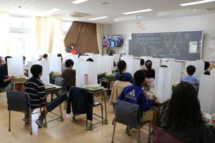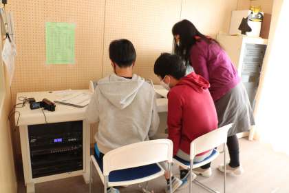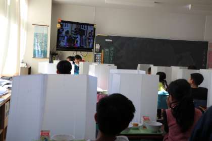 音楽委員会による、校内放送です。音楽委員会が「真赤な秋」の合奏をしたビデオを各教室に流します。静かに給食を食べながら、配膳を進めながら、どのクラスも静かに演奏を聴いています。