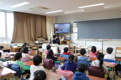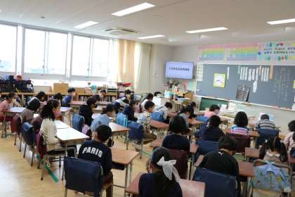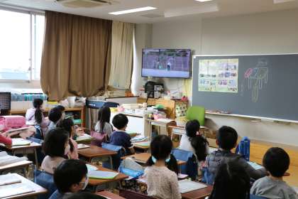 放送室からテレビを使って全校朝会です。朝の挨拶をすると、放送室まで届くほどの元気な声であいさつが返ってきます。今日は、交流活動で頑張る上学年4・5・6年生の様子や、交流活動を通して意識してほしい相手を思いやる行動や言葉について話しました。