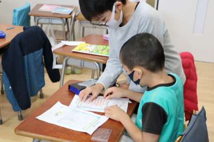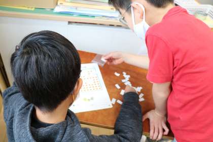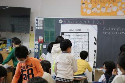 「かけ算パズル」を楽しんでいる様子です。作ったパズルを友達と楽しんだり、挑戦したり、楽しくかけ算のまとめの学習に取り組んでいます。