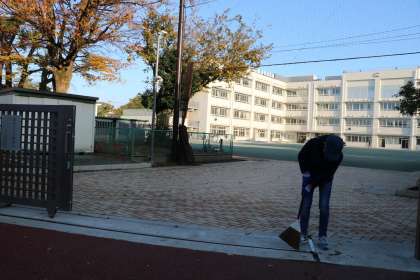 今日から2週間、6年生による学校の回りの落ち葉をきれいにするボランティア活動が始まりました。7:45に登校し、朝礼台の上にランドセルを置いて掃除が始まります。