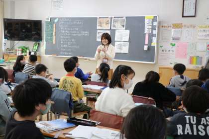 先生の話、友達の発表を目と心で真剣に聞き、考えを深めます。思ったことを安心して言える、温かい雰囲気のある学級です。