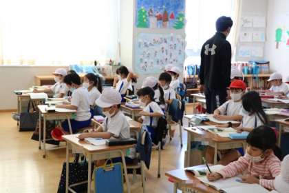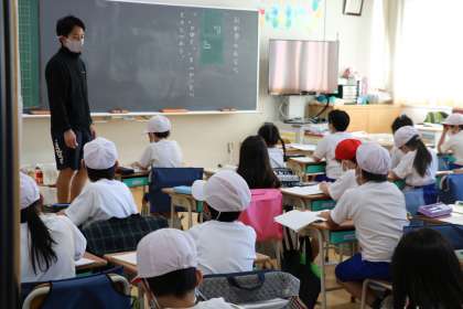 集中して学習に取り組む1年生です。『 』の使い方の話を真剣に聞いて、実際にどのように使うか考えます。