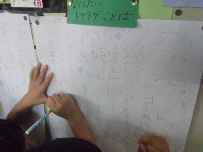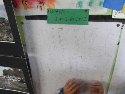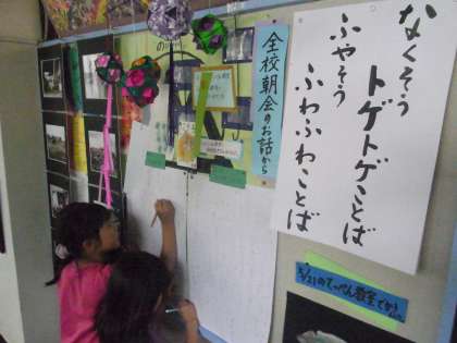 先週に引き続き、今週も全校朝会で「トゲトゲ言葉、ふわふわ言葉」について話しました。そして、校長室に前の廊下に紙を貼っておくので、なくしたいトゲトゲ言葉と増やしたいふわふわ言葉を書いて下さいとお願いしました。すると、子どもたちは何人もやってきて、そこに書き込んでくれます。トゲトゲ言葉の中身をみると、本当に心が痛くなるような言葉ばかりです。絶対になくしたいです。その反対に、ふわふわ言葉を見ると、心が温かくなってきます。山野小学校では、子どもも大人もふわふわ言葉でいっぱいにしたいです。