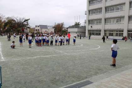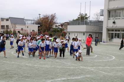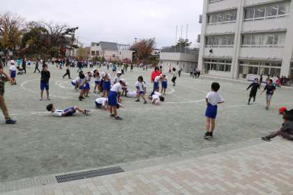 写真は、1年生が暮らすみんなで遊んでいるところです。「だるまさんがころんだ」ならぬ「だるまさんの一日」です。「だ・る・ま・さ・ん・が・はみがきした」…など鬼の出すお題が楽しいです。