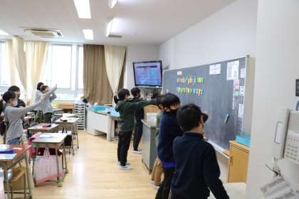 授業の始まりは、歌に合わせたこのアクティビティーから始まります。「右手、左手…」と、英語で歌が流れます。
