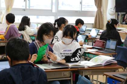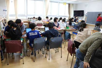 意見文を書くための資料集めの様子です。図書資料やインターネット資料などただ読むだけではなく、必要な情報を読み取る…学習内容も4年生後半になると深くなります。
