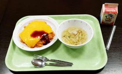 今日のメニューはオムライス、白菜スープ、牛乳です。