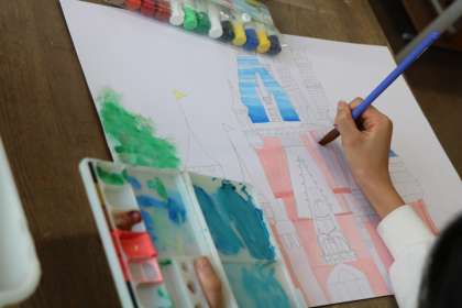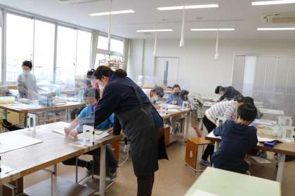 「時空を超えて」作品作りの様子です。中学に行っても使える水彩の技法を、たくさんアドバイスいただきながら彩色に集中しています。