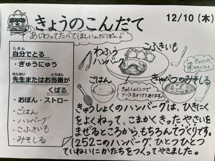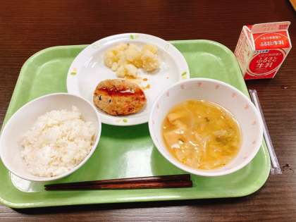 今日は、和風ハンバーグ、こふきいも、キャベツのみそ汁、牛乳です。