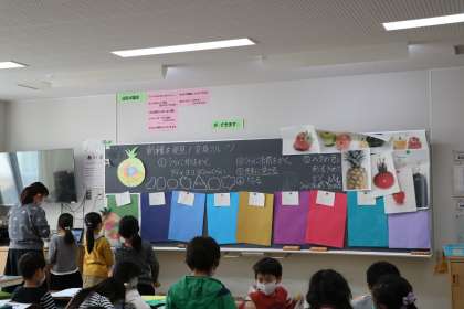 「新種発見 変身フルーツ」の制作の様子です。台紙の色はどれが合うか、実際に自分のフルーツを置いて考えています。