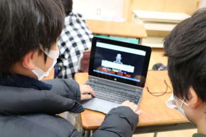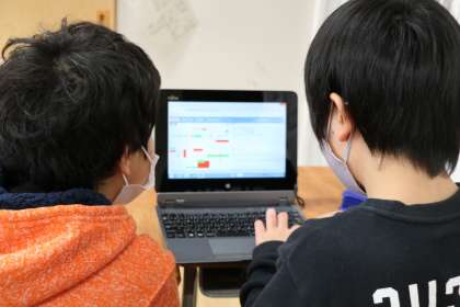 スクラッチのサイトでプログラミングの操作方法を試している「パソコンクラブ」の様子です。