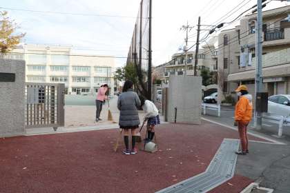 砧町自治会の皆様、登校時間の見守りありがとうございます。掃除をしている6年生にも声をかけていただきます。