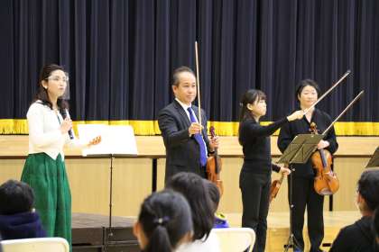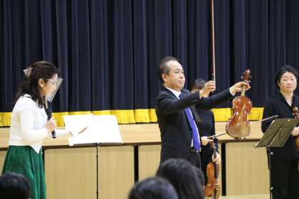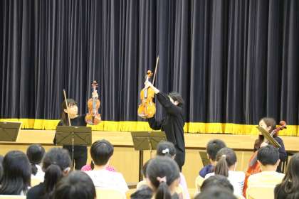 山野小学校の体育館が演奏会場です。いすを並べて準備をするのも5年生自身が行います。会場に入場していらした5人の方がまず演奏してくださったのは「アイネ・クライネ・ナハトムジーク」です。いきなり、クラッシック音楽の世界に引き込まれていく子どもたちです。