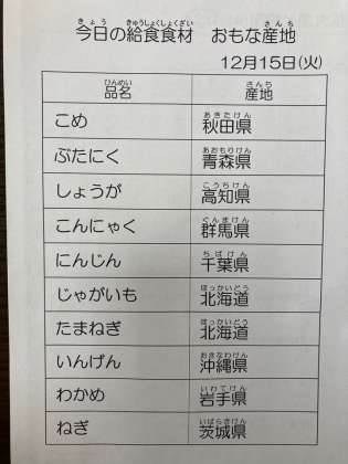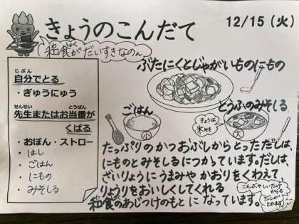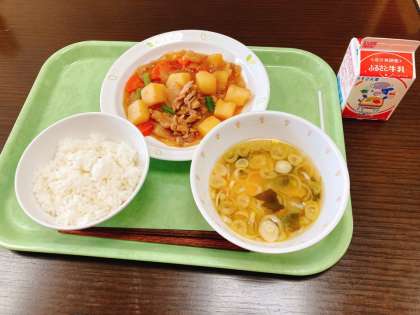今日は、ごはん、豚肉とじゃがいもの煮物、豆腐のみそ汁、牛乳です。