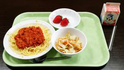 今日のメニューはスパゲッティミートソース、ポテトチップスサラダ、いちご、牛乳です。