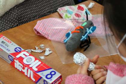 「新種発見!合体昆虫」の様子すです。先にできた作品が、買ってきた見本の人形なのかと思うくらい、とてもかわいく、工夫されてできています。