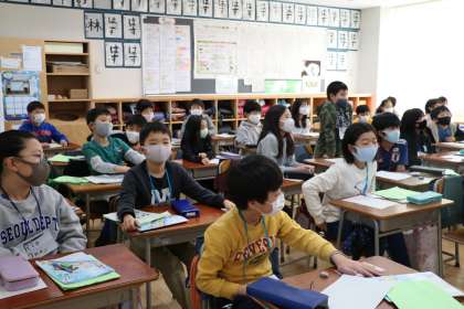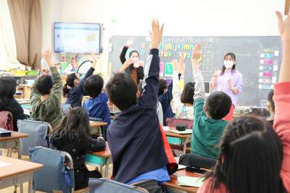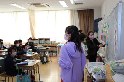 子どもたちが意欲的に頑張っている様子です。これ以上伸びないほど手を挙げてアピール。かわいいです。