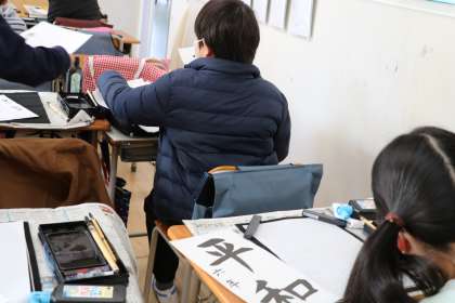 書初めの練習をしている様子です。小筆を使って名前の練習をしています。とても心のこもったいい字を書いているのですが、名前なので…少し遠くから撮影。