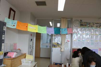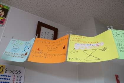 教室には1週間宣伝の看板を掲示していたそうです。あのお店屋さんに行ってみたいなあ、あのお店屋さんはどんなものがあるかなあ。と楽しみに今日を迎えたのでしょう。子どもたちからは「校長先生見て見て。」の声がたくさんかかり、自慢の品物の数々を見せてもらいます。