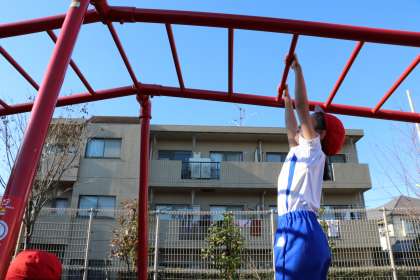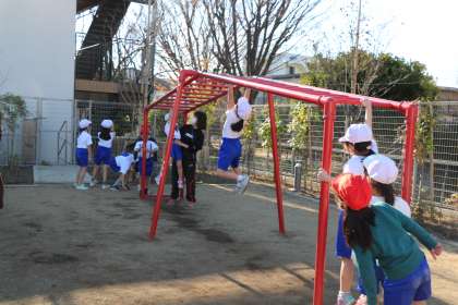 体育の研究授業を参観しました。「鉄棒遊び」の学習です。まずはうんていやジャングルジムに挑戦です。鉄棒を握る力につながる大事なウォーミングアップです。