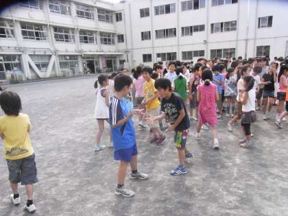 今日の児童集会は、名刺交換ゲームでした。各学年の色の名刺を6枚ずつ用意ています。先生達も白色の名刺を用意しました。じゃんけんで勝ったら、相手の名刺をもらえます。6色そろったら、合格です。みんな必死にじゃんけんをしました。私もたくさんの子どもとじゃんけんをしましたが、用意した6枚の名刺は6色そろう前になくなってしまいました。残念。人と関わり合う事を目的としたこのようなゲームは、けっこう盛り上がりますね。