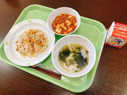 今日は、チャーハン、麻婆豆腐、ワンタンスープです。