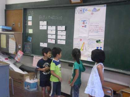 2年生は生活科の時間に地域探検に行き、そのことをグループごとに新聞にまとめて発表会をしました。グループごとに地域探検するのも初めて。協力して一枚の大きな新聞を作ることも初めて。でも、力を合わせて何かをやり遂げることの大切さを、2年生なりに感じながら活動していました。地域探検の際には、たくさんの保護者の方に付いていただき、ありがとうございました。本当に助かりました。