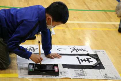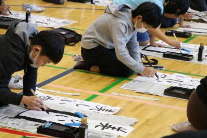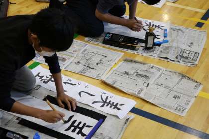 最初の一枚目は全員で、一画一画、コツを確認しながら書き進めます。始筆・終筆の向きや力のかけ方、一文字の配分など、先生の言葉を聞きながら一緒に書いています。