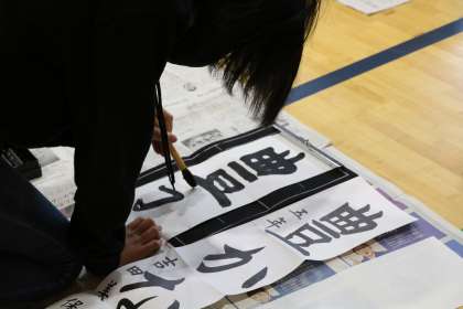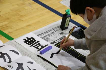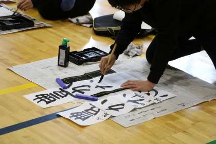 新聞紙を広げた上に自分の道具を置きます。マスク着用、おしゃべりをしないは徹底します。おしゃべりをしないために一人一冊本を持ってきましたが、本を読む暇もないほど集中して自分の書き初めと向き合い取り組んでいます。