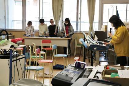 写真は5年生がトーンチャイムで演奏する様子です。「もののけ姫」を演奏しています。