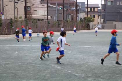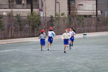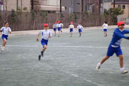 授業の始めに5分間走に取り組んでいます。急に早く走ったり、遅くなったりするのではなく、ずっと同じペースで走ることが大切です。自分のペースをつかめるといいです。持久走は、人との競争ではなく、自分との競争です。