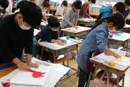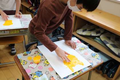 「鬼がきた」の作品に取り組んでいます。今日はまず、画用紙いっぱいに鬼の顔を描きます。アクリル絵の具を使って指で描きます。絵具の感触や画用紙に書く手触りを楽しんでいます。「うわ〜気持ちいい!」「とろとろ〜」「つのがいい感じに描けそう」とワクワクしている感想を言いながら自分の作品と向き合っています。