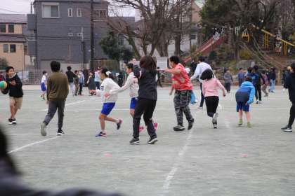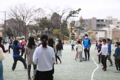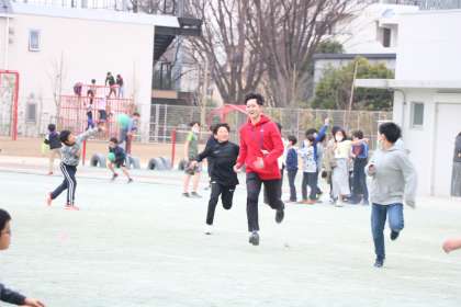 昼休みも高学年が元気に外遊びです。山野小学校では、担任の先生も子どもたちといっしょに遊ぶ「共遊び」を推奨しています。教室では見られない、子どもの様子、子ども同士の関わりを見ることができる貴重な時間です。