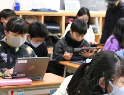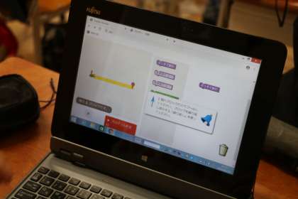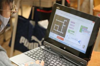 総合的な学習「プログラミング学習」の授業の様子です。ブロックリーというツールを使ってプログラミングを学びます。ビジュアルプログラミング言語で、パズルのようにブロックを組み合わせることで、プログラムを作ることができます。ブロックで作ってみてから実際にどのようなプログラミング言語でできているのか、ソースコードを見て確認することができるので、次の学びが広がります。