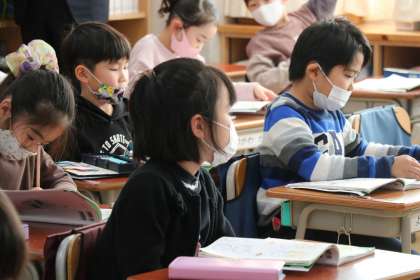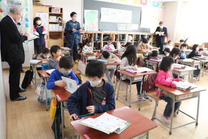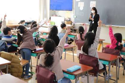 昨日、1年生の研究授業の様子です。小さい目盛り1つは1分。短い針は分、長い針は時を指すなど「時刻と時間2」の学習です。今まで何時とか何時半と読んでいた時計も、より正確に読むように、子どもたちは一生懸命目盛りを見ながら数え、考えていました。