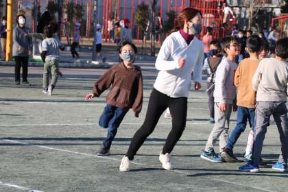 水曜日の朝は低学年のロング外遊びの日です。担任の先生と一緒に遊んでいるクラスもあります。北風が強い朝でしたが、校庭には先生と子どもとの共遊びの姿がたくさん見られます。こころと体はぽっかぽかです。今後とも、先生と子どもが共に汗を流しながら共遊びをしていきます。