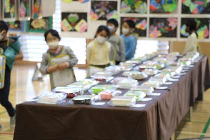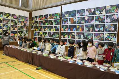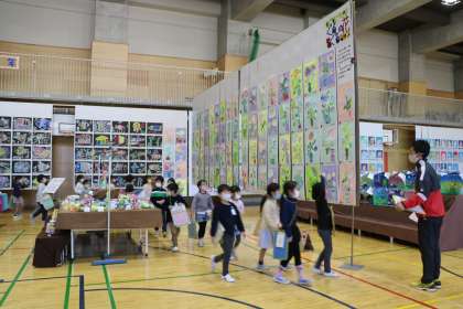 山野ミュージアムでは1年生が鑑賞しています。担任の先生が列を先導しながら、各学年の作品について話をしてくれます。一通り回ったら、次は自分の気になった学年を一人で鑑賞します。「しゃべらない、走らない、触らない」の約束を確認して、静かにゆったり鑑賞できる1年生です。