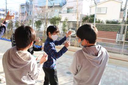太陽電池の実験をしている様子です。「豆電球どのくらいの太陽光でが光るかな?」「モーターが回るかな?」「どこなら一番太陽光をあつめられるかな。よく屋根の上についているからやっぱり高いところほどいいんじゃないか?」など、いろいろ考えながら実験しているようです。