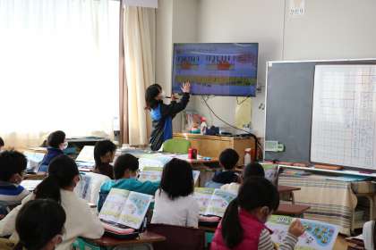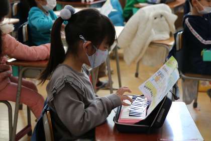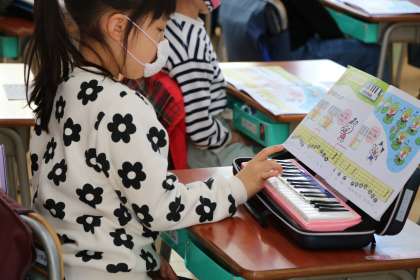 カエルの歌が…と先生のドレミで歌う声が聞こえてきます。鍵盤ハーモニカにふき口は付けず、運指のみ練習しています。「み・ふぁ・そ・ら・そ・ふぁ・み…は指替えがポイント」なのだそうです。何度も何度も練習する子どもたちです。