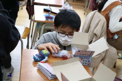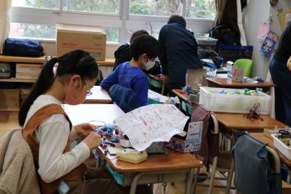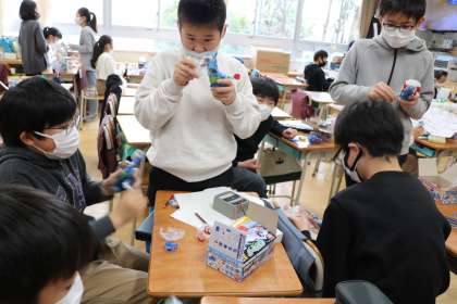 「電気と私たちの生活」の学習です。コンデンサーに電気をため、その電気を使ってみようと実験をしています。1人1個の手回し発電機で、電気を蓄えるとモーターが回ることを確かめています。