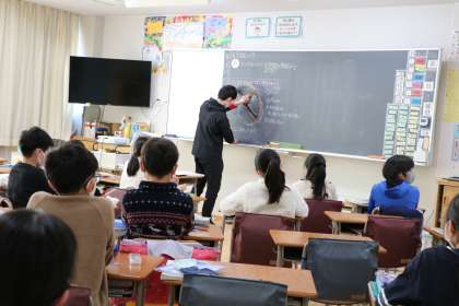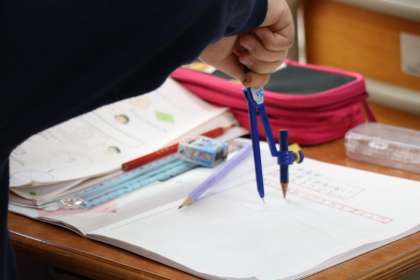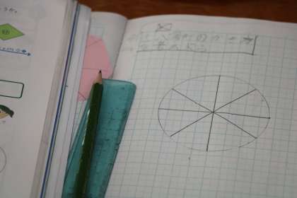 「多角形と円」の学習です。正八角形の書き方を考えます。コンパスや分度器の使い方も5年生ともなると、とてもスムーズに扱えるようになります。