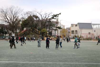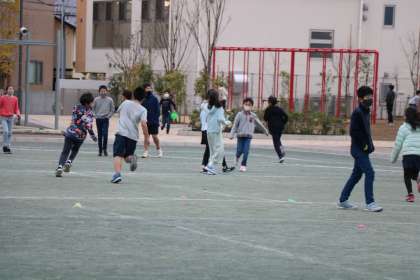 月曜日の朝は、高学年のロング外遊びです。曇り空の、小雨が少しぱらつく時間もある朝でしたが、子どもたちは元気に体を動かしています。