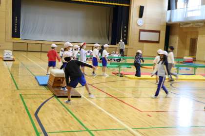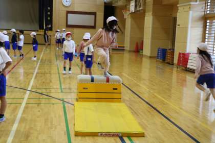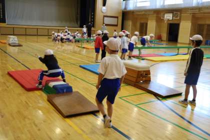 「とび箱」の学習の様子です。安全に行うための準備と決まりを確認してから、場所をみんなで準備し手から始めます。