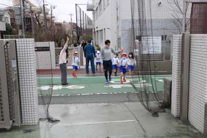 道路を渡るときは手を挙げて左右を確かめます。車が入ってこないようになっていますが、自転車が来ることもあります。警備の方や、看護当番の先生がいますが、自分の命は自分が守るのがまずは第一。どこでも、いつでも左右確認の習慣をつけましょう。