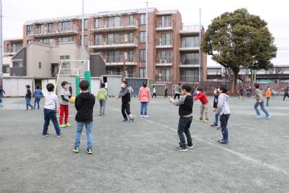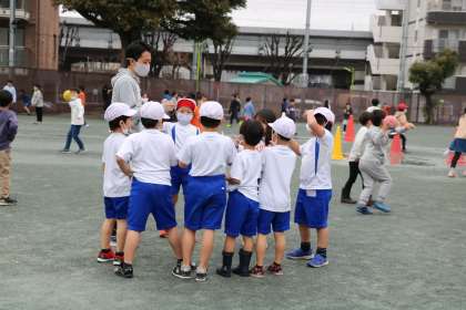 2年生は円を作ってバレーボールに挑戦です。何回続くかな。