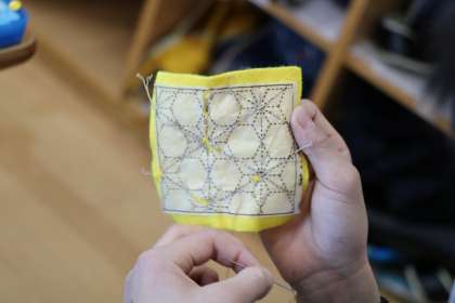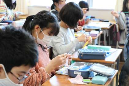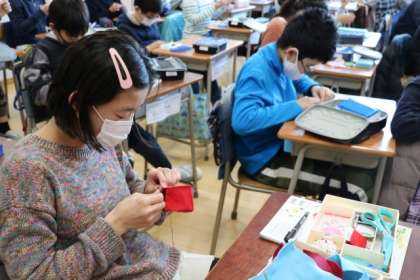 家庭科2時間続きの学習の中で、毎回少しの時間でも、針をもち手を動かして運針の練習を重ねるようにしています。コースターや、小物に挑戦している様子です。