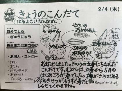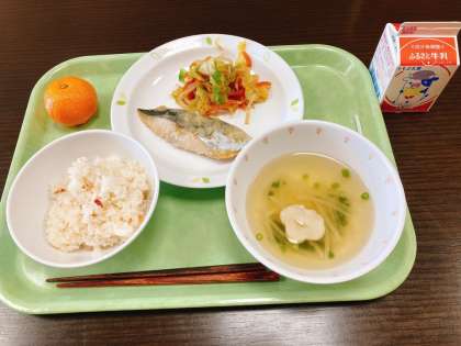 今日は、梅おこわ、さわらのねぎみそ焼き、野菜のおかかあえ、立春すまし汁、みかん、牛乳です。