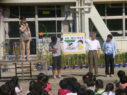 梅雨も明け、暑い日が続いています。月曜朝会では、養護教諭が熱中症対策についてお話ししました。体育館での朝会も考えましたが、体育館に全校児童が集まったときの熱気を考え、風通しのある校庭で、しゃがんで実施しました。夏季休業中も含め、この暑さに負けないようにしていきたいですね。